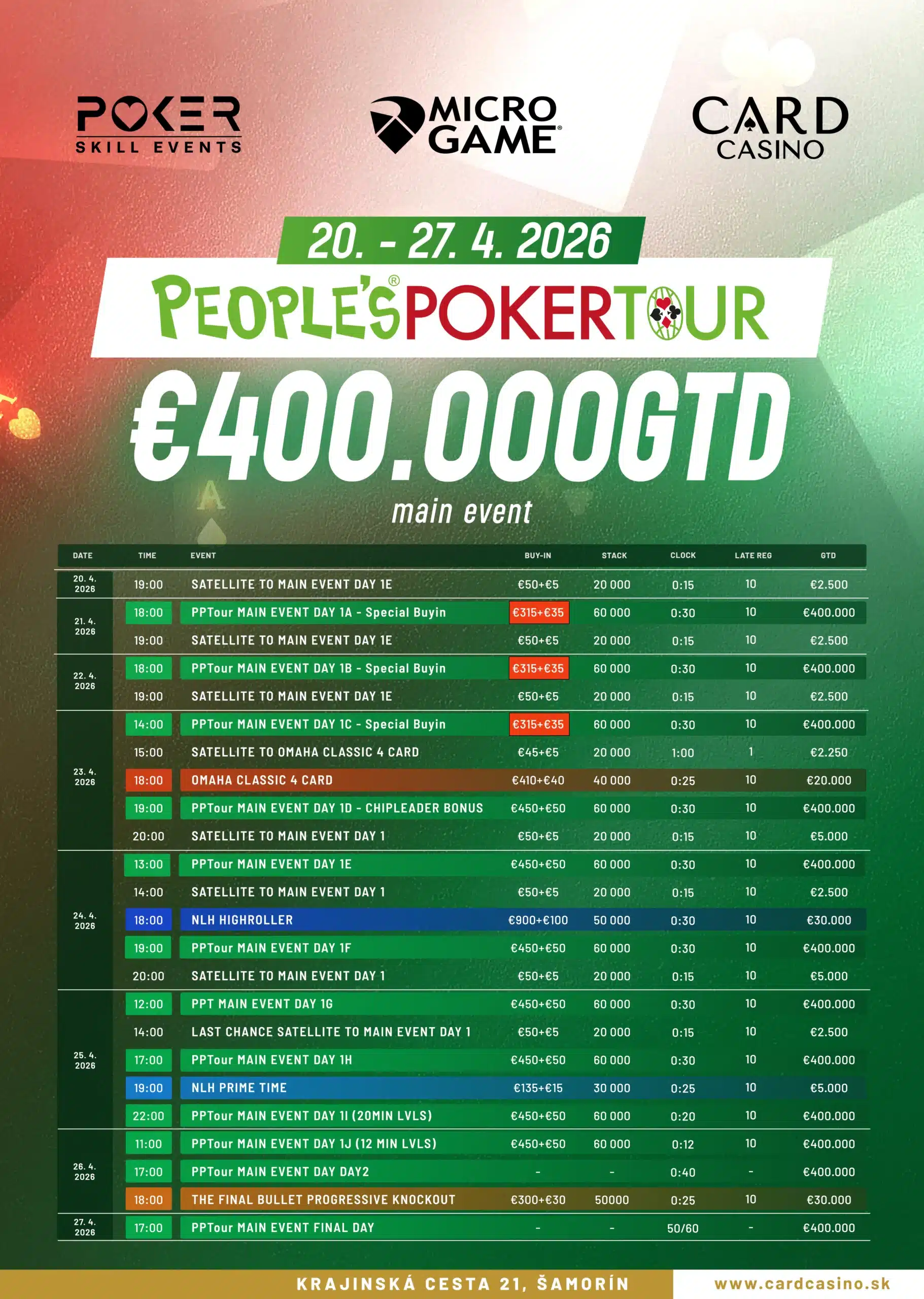 Ak sa rozhodneš zahrať si poker ešte dnes, pozri si náš aktualizovaný rozpis turnajov. Denne prinášame informácie o tom, kde sa hrá poker na Slovensku, vrátane časov začiatkov, buy-inov a typov turnajov. Vďaka tomu ti neujde žiadna príležitosť a vždy budeš vedieť, kde práve teraz prebieha zaujímavá akcia.